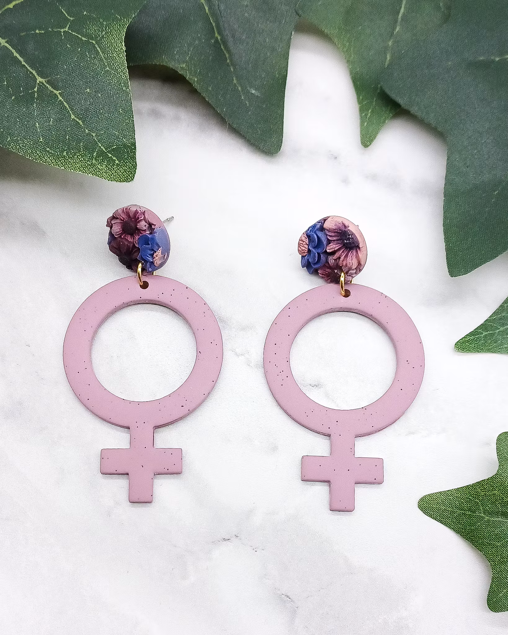 Varmt lila venustecken med stiftplutt med blommor. Örhänget är 6,5 cm långt.