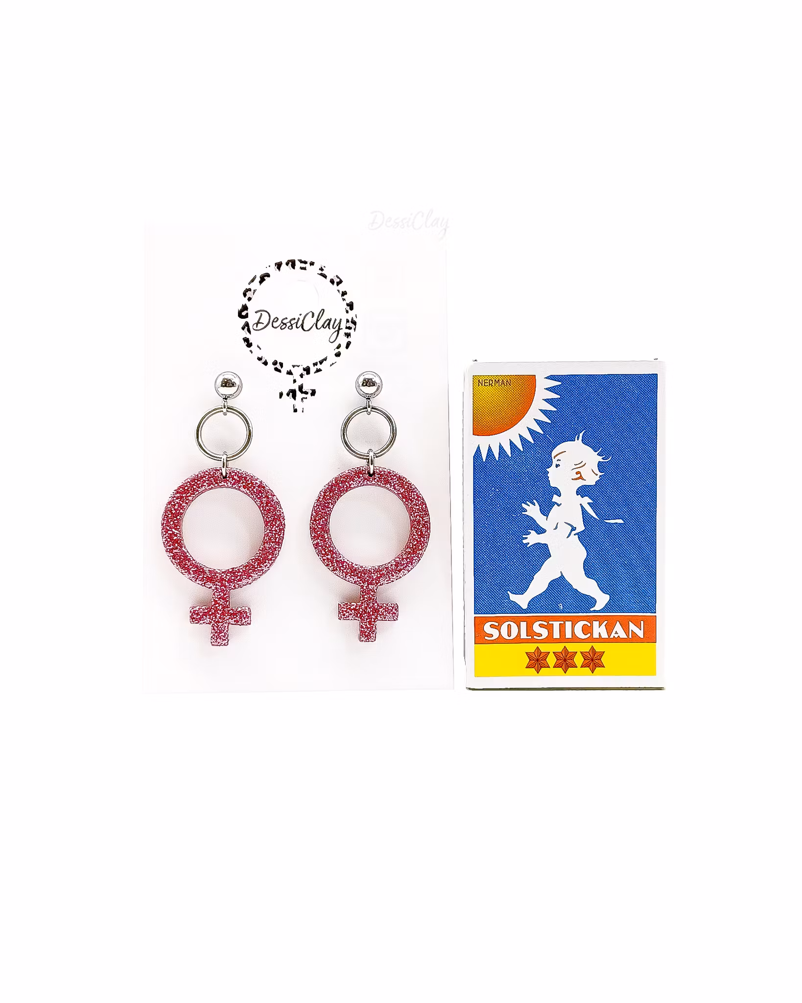 Örhängen i form av kvinnotecken i mörkrosa med glitter på framsidan. Perfekt till fest eller när du vill känna dig lite extra fin en vanlig dag. Örhänget är strax under 5 cm långt och 2 cm brett.